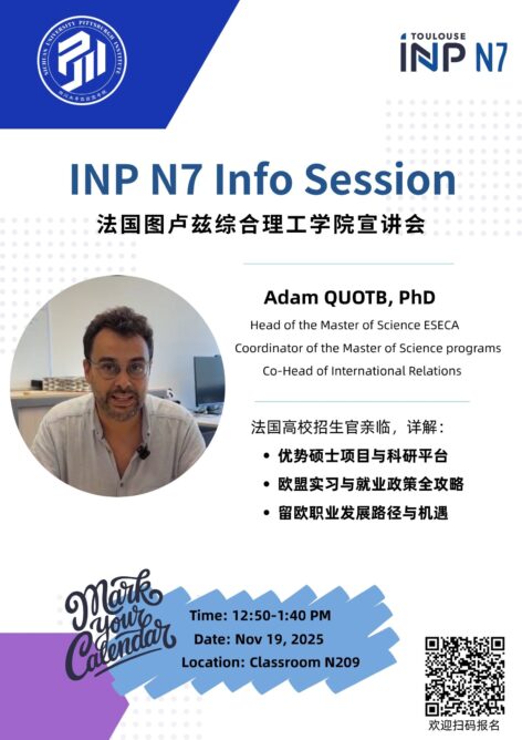 时间:2025年11月19日中午12点50分至13点40分 地点:江安南校区匹兹堡学院N209教室 主讲人:Adam QUOTB教授 嵌入式和通信应用电子系统理学硕士项目主任 理学硕士项目负责人 国际关系主任 法国高校招生官亲临,详解: 优势硕士项目与科研平台 欧盟实习与就业政策全攻略 留欧职业发展路径与机遇 欢迎大家扫码报名