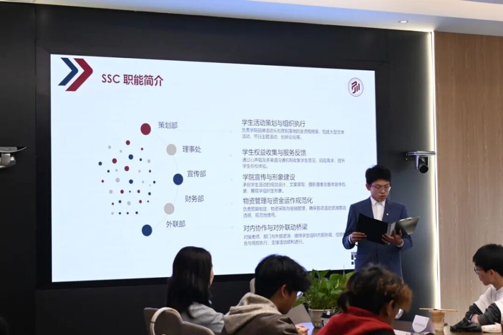 匹兹堡学院代表率先进行分享,展示了学院学生组织架构、工作流程及协作机制,同时重点介绍了学院特色品牌活动,引发了在场各学院代表的浓厚兴趣与热烈提问。不少参会同学表示,不同学院学生组织存在显著差异,能给彼此提供借鉴 ——而这正是本次交流会的意义所在:理解他者实践,吸收优秀经验,观照自身短板,启发工作思考。