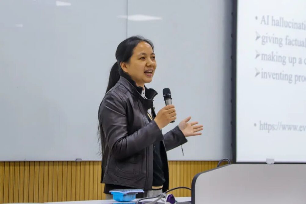 李玉梅老师以生成式人工智能 (Generative AI) 的工作原理开篇,重点引入了“AI幻觉” (AI hallucinations) 这一概念。“AI幻觉”是指大型语言模型在运行时会自信地生成虚假的、误导性的或编造的信息。李老师结合自己研究型英语论文写作课程教学经历和ChatGPT应用经历详细介绍了“AI幻觉”现象,提醒同学们在使用AI工具辅助科学研究时要保持谨慎批判的态度,仔细辨别AI生成内容的真实性。