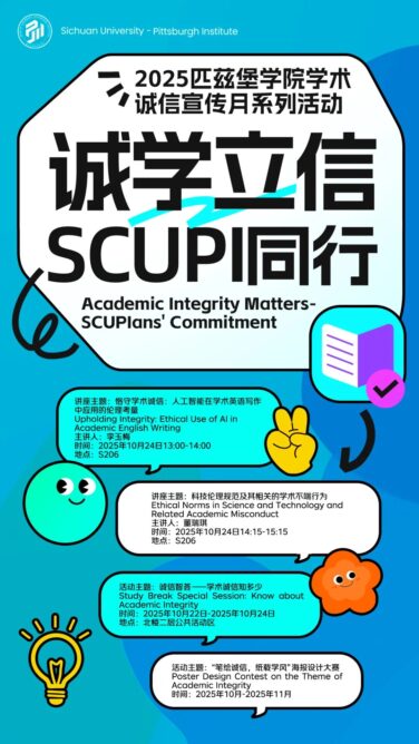 为引导同学们树立诚信意识,严守学术诚信底线,学院举办了2025匹兹堡学院学术诚信宣传月系列活动。作为系列活动的一部分,2025年10月24日下午1:00,在四川大学江安校区南区S206,匹兹堡学院副教授李玉梅、助理教授董瑞琪分别围绕学术诚信向同学们进行了精彩的讲座分享。