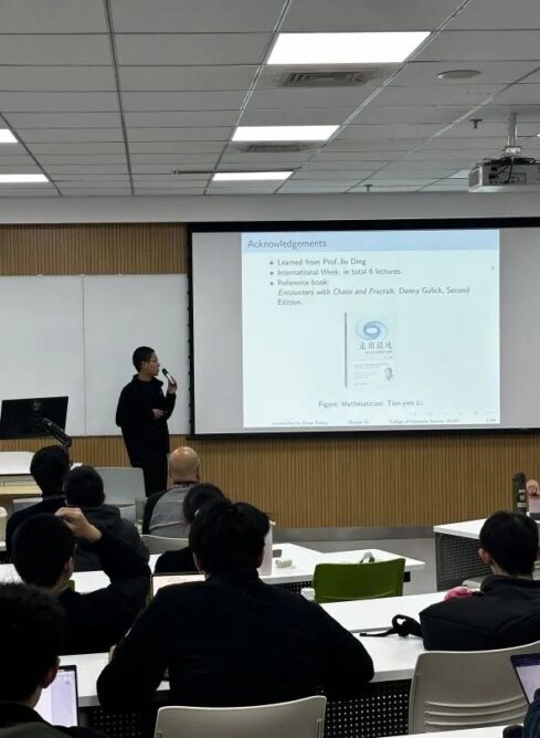 Speaker Yuchen Wang began with Lorenz’s accidental discovery in 1963, which overlooked the third decimal place, and deconstructed the Lorenz attractor, the three-body problem, and the metaphorical chaos in the novel The Three-Body Problem. He then extended the discussion to real-world cascade effects such as weather patterns, financial flash crashes, and pandemic spread. Finally, he offered a glimpse into the future through high-performance computing and chaos control.
