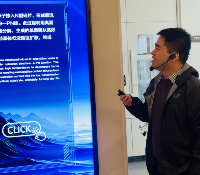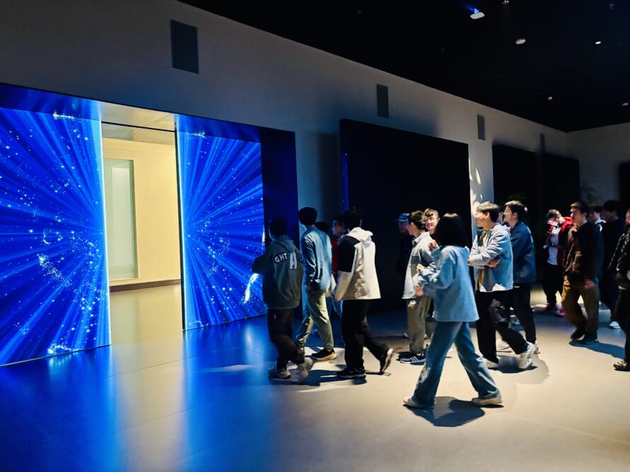 Guided by engineers, students walked through the production floor to observe key stages such as polysilicon refining, HJT high-efficiency cell laser scribing, and stack-bussing module assembly. In the immersive exhibition hall, an 180° curved screen displayed a live feed from the world’s largest single-site photovoltaic plant, while a dynamic light show titled “Pangu Creating the Sky” depicted solar energy flowing into urban power grids, drawing audible admiration from the audience.